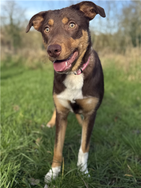 She is a confident friendly girl and should be suitable to live with children. She is housetrained and crate trained, responds to basic commands and is fine meeting other dogs out on a walk.